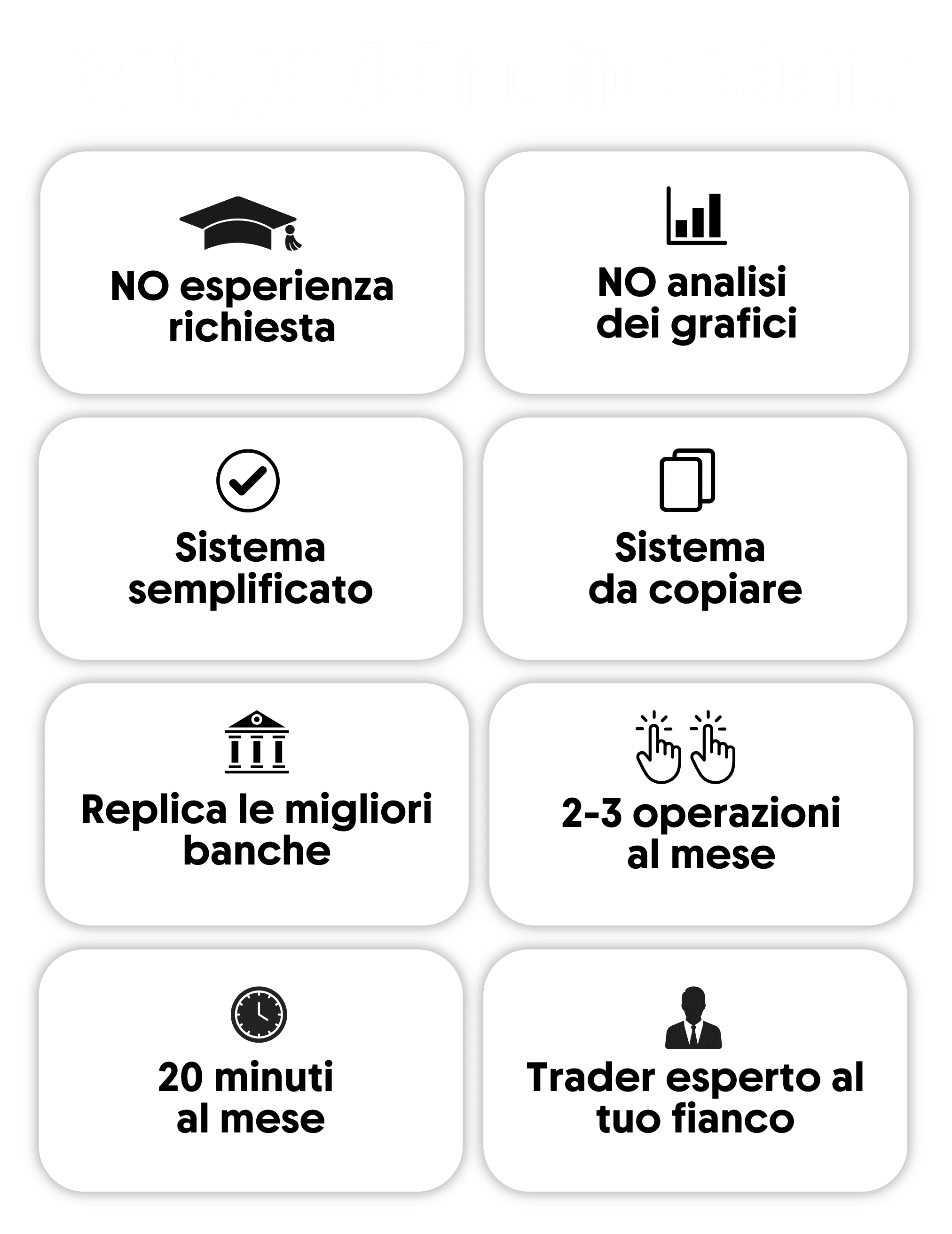 Genera dai 50 ai 100€ al giorno, SFRUTTANDO un sistema SEMPLIFICATO, con sole 2 o 3 operazioni al mese, dedicando appena 20 minuti, replicando le operazioni SICURE delle grandi banche